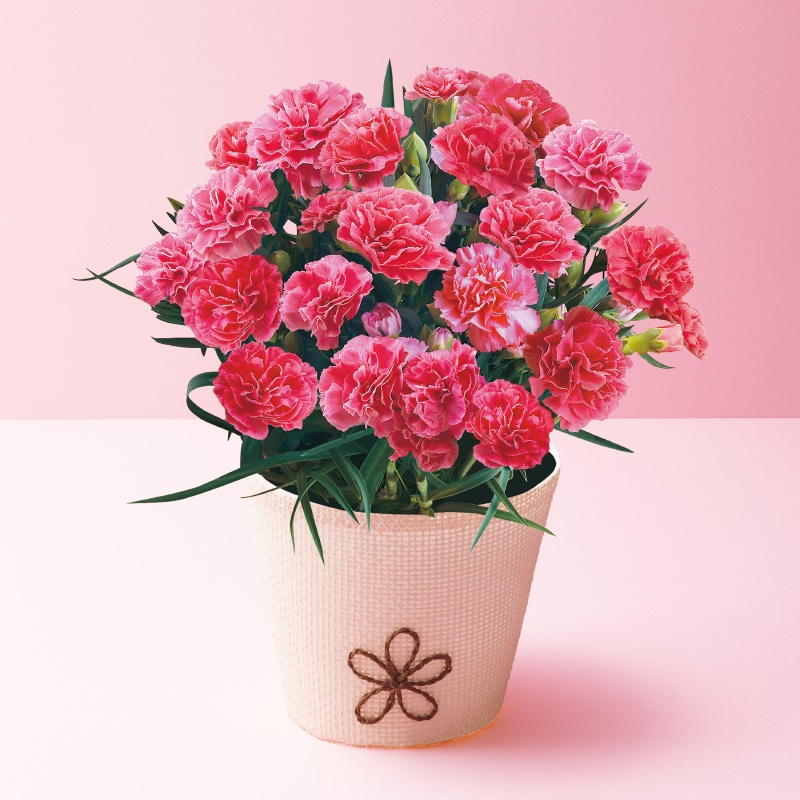 カーネーション4号鉢、バスケット、ラッピング、お手入れのしおり、商品サイズ:高さ 約25cm × 鉢直径 約12cm