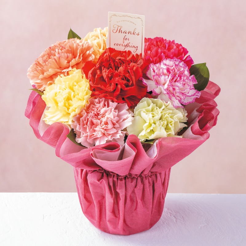 カーネーション9本、丸葉ルスカス1本他 高さ 約25cm × 幅 約17cm