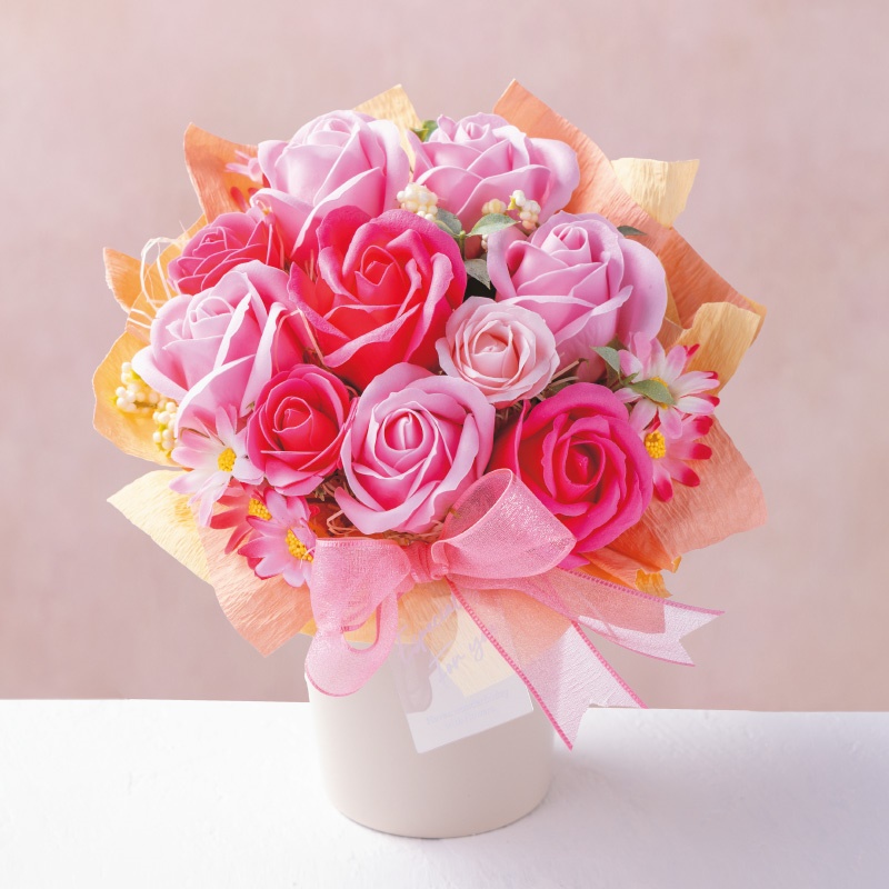 ソープフラワー(ローズ大×7、ローズ小×3)造花:マーガレット、リーフ他 高さ:約22cm、直径:約22cm
