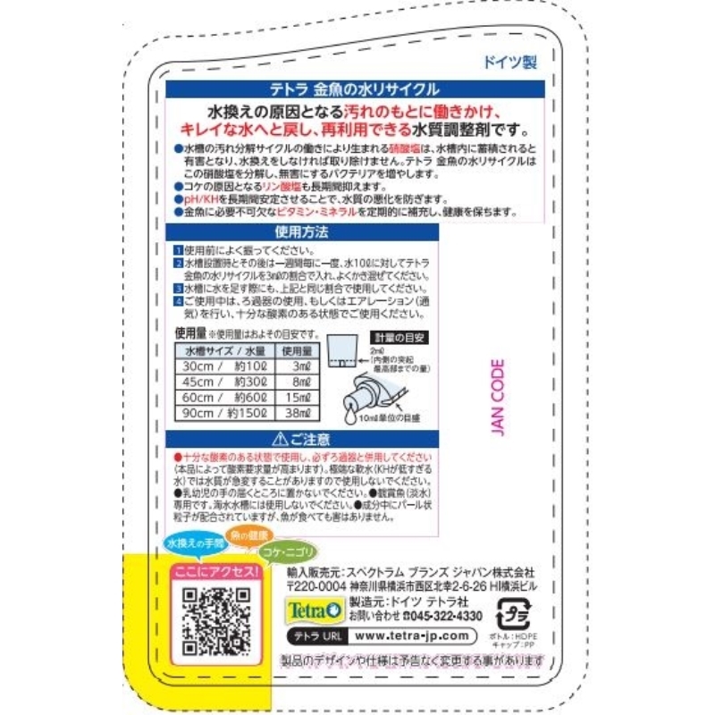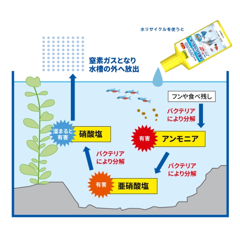 テトラ 水リサイクルは、この硝酸塩を分解するバクテリアを増やすことで、硝酸塩濃度を低く保ち、