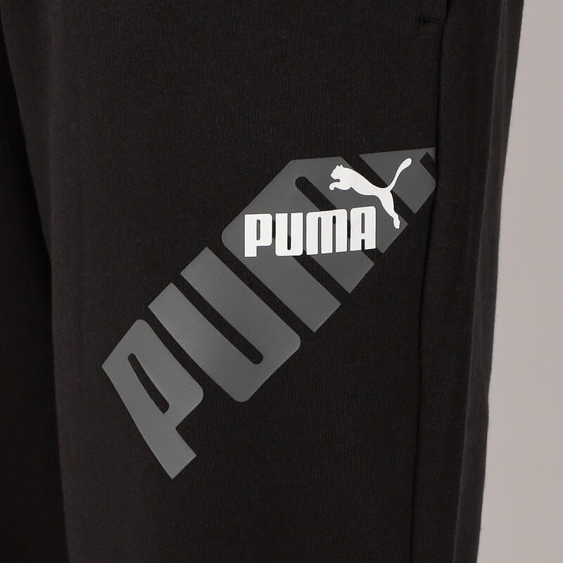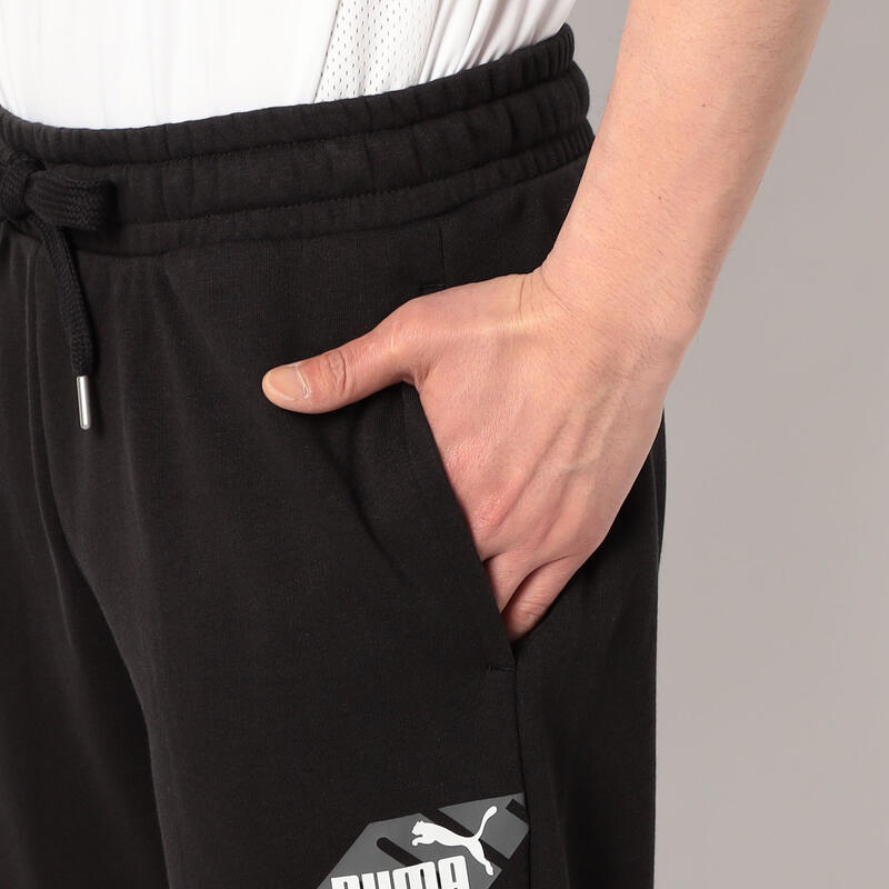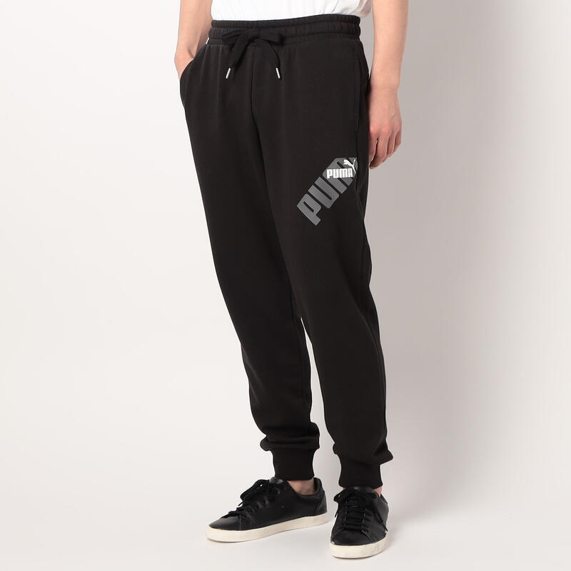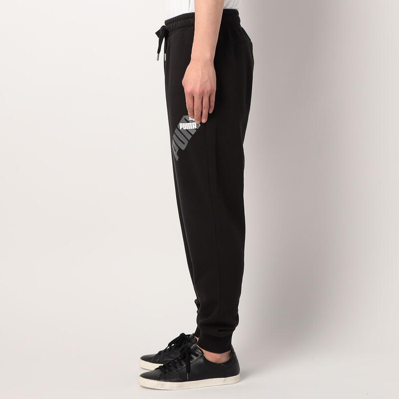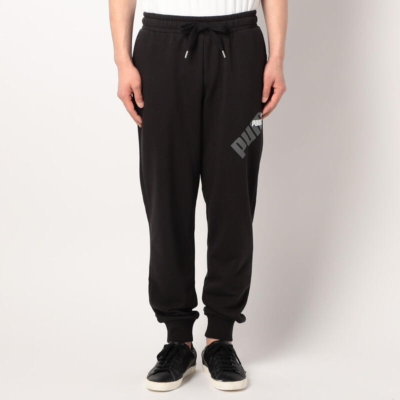 左もものブランドロゴが特徴のスウェットパンツ。