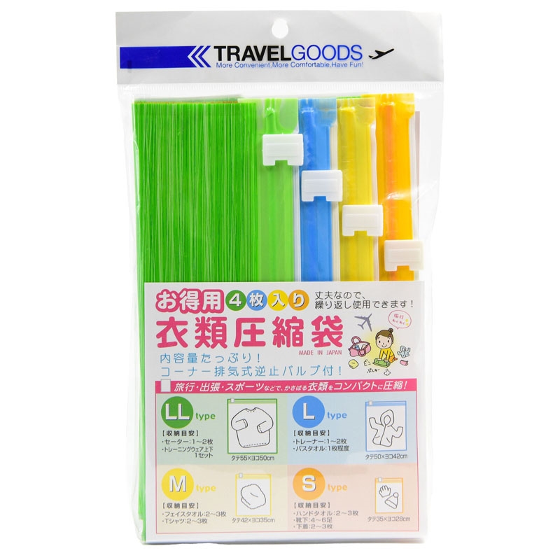 S・M・L・LLのサイズが1枚ずつ入ったお得用の衣類圧縮袋です。