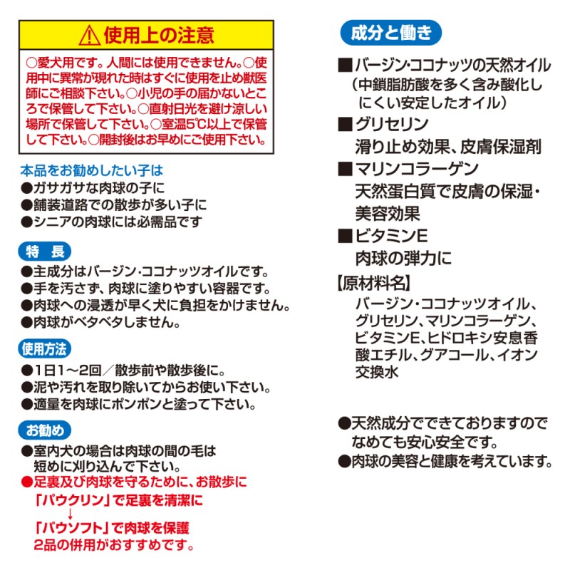 - バージン・ココナッツオイル、グリセリン、マリンコラーゲン、ビタミンE、ヒドロキシ安息香酸エチル、グアコール、イオン交換水