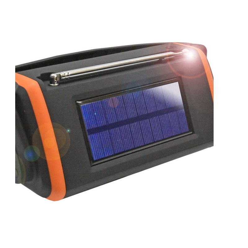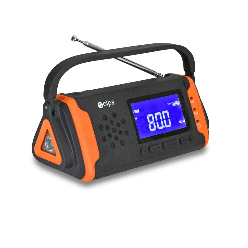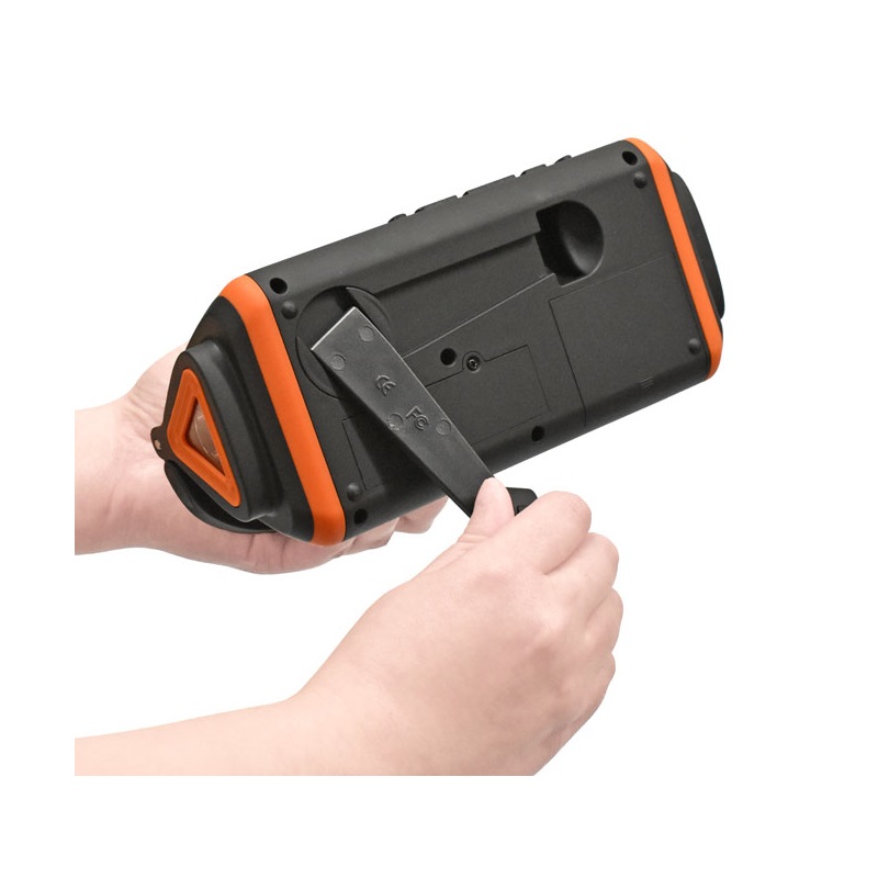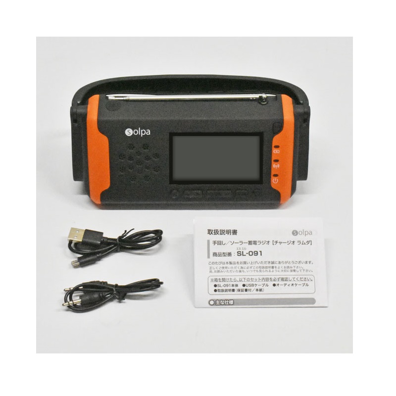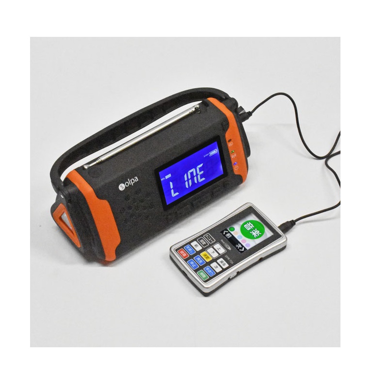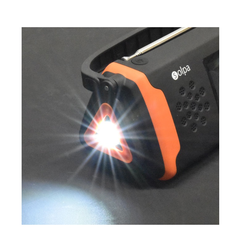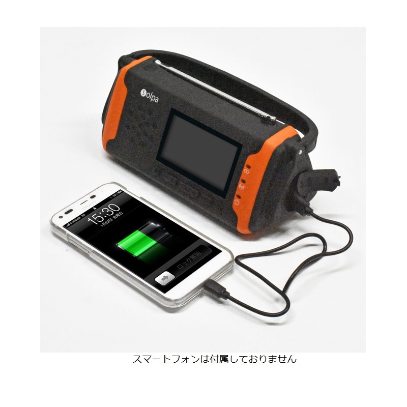 により蓄えた電力で、ラジオ放送の受信、スマートフォンの充電や、懐中電灯、SOSアラームと、コンパクトな本体