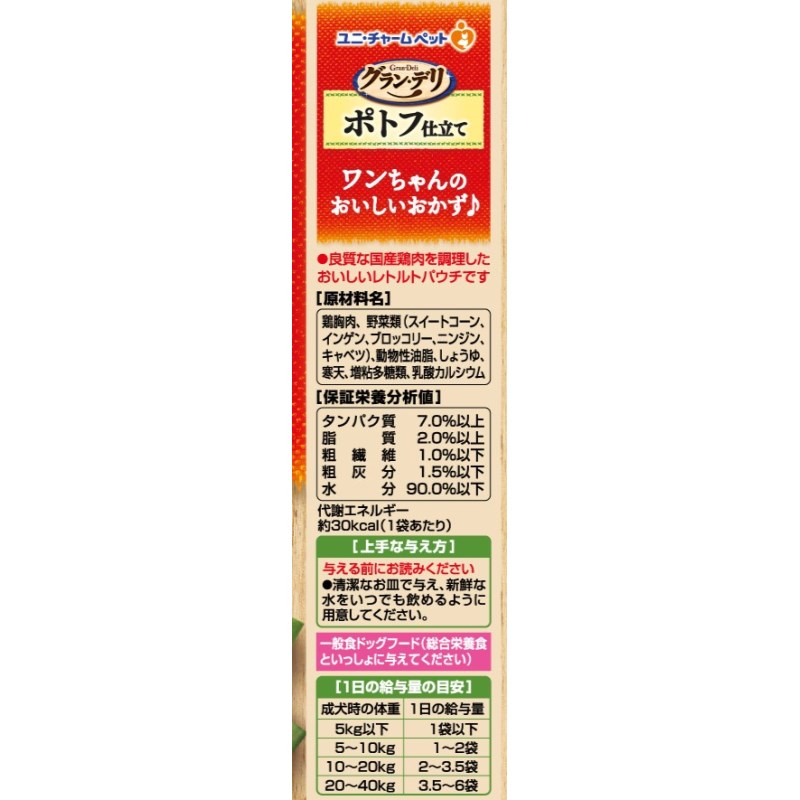- 鶏胸肉、野菜類(スイートコーン、インゲン、ブロッコリー、ニンジン、キャベツ)、動物性油脂、しょうゆ、寒天、