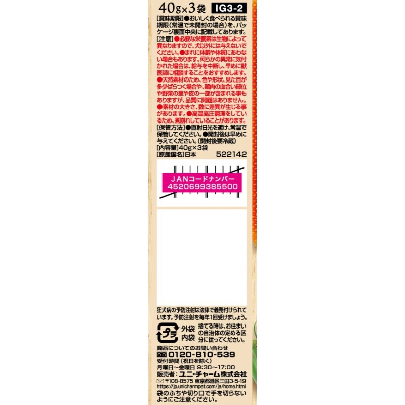 ●良質な100%国産鶏肉を使用\n・にんじん、インゲン、ブロッコリー、コーン、キャベツ使用