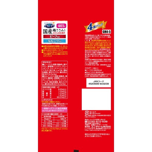 なんこつ入り:肉類(鶏胸肉、鶏ササミ、鶏軟骨)、野菜類(ニンジン、グリーンピース、スイートコーン)、しょうゆ、