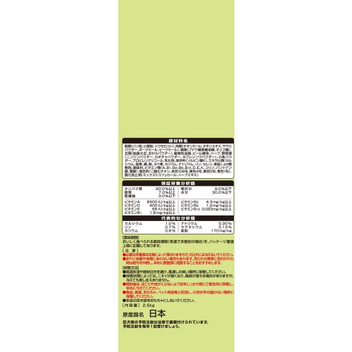 ウダー)、魚介類(乾燥小魚)、プロピレングリコール、ミネラル類(カルシウム、塩素、銅、ヨウ素、ナトリウム、リン、亜鉛)、