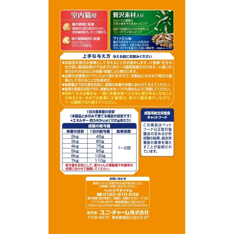 かつおミール、白身魚ミール、乾燥シラス)、セルロースパウダー、動物性油脂、野菜類(ビートパルプ)、ビール酵母、