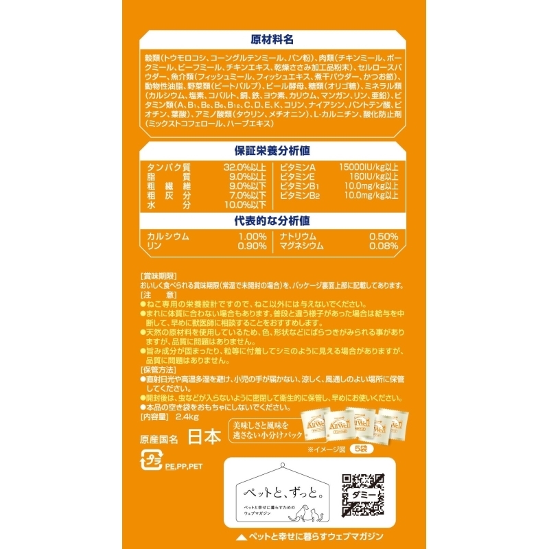 乾燥ささみ加工品粉末)、セルロースパウダー、魚介類(フィッシュミール、フィッシュエキス、煮干パウダー、かつお節)、