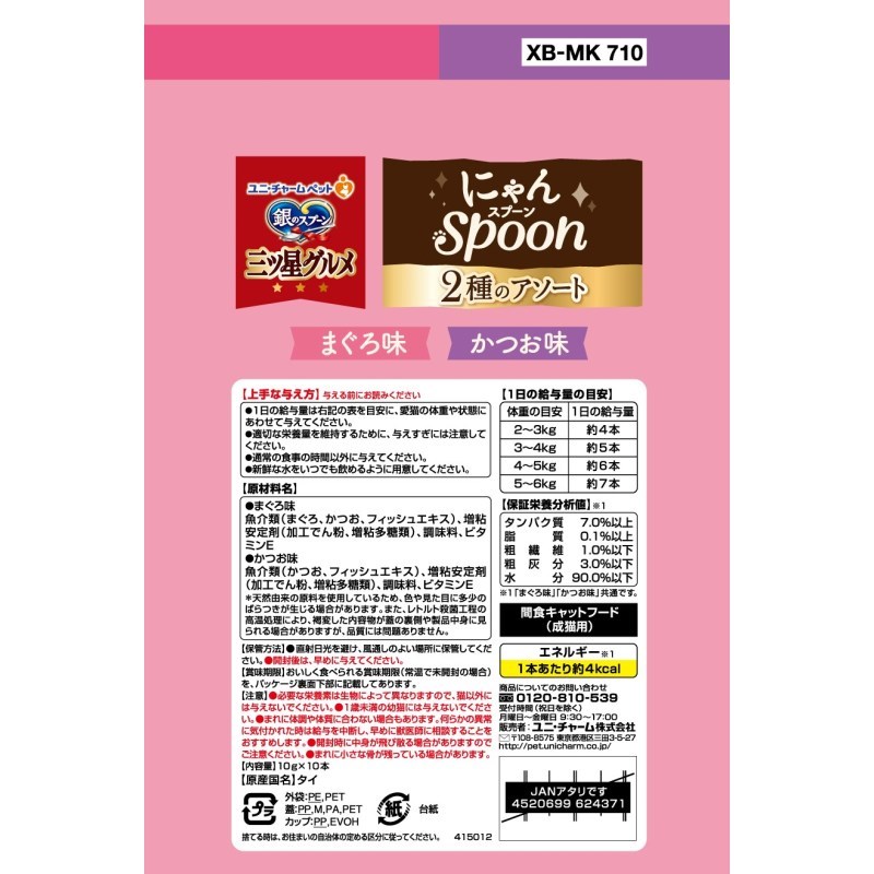- ●まぐろ味:魚介類(まぐろ、かつお、フィッシュエキス)、増粘安定剤(加工でん粉、増粘多糖類)、調味料、ビタミンE