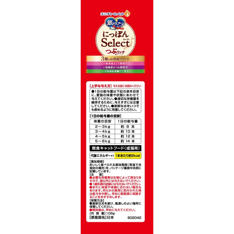 - まぐろ節使用:鶏胸肉、魚介類(まぐろパウダー、焼津産まぐろ節)、寒天、調味料、増粘多糖類、乳酸カルシウム
