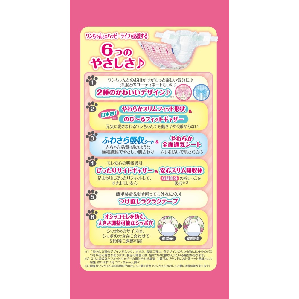 ・「安心スリム吸収体」で、6時間分のおしっこを吸収します。