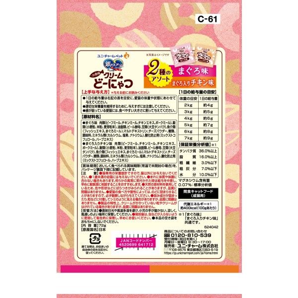・まぐろ&まぐろ入りチキン味の2種の味が楽しめるアソートタイプのおやつです。