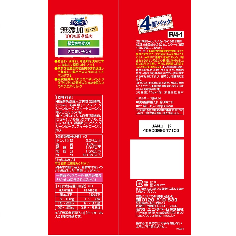 【さつまいも入り】肉類(鶏胸肉、ささみ)、いも類(さつまいも、こんにゃく粉)、野菜類(ニンジン、グリーンピース、