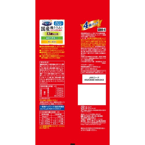 - 緑黄色野菜入り:肉類(鶏胸肉、鶏ササミ)、野菜類(ニンジン、グリーンピース、スイートコーン)、しょうゆ、砂糖、