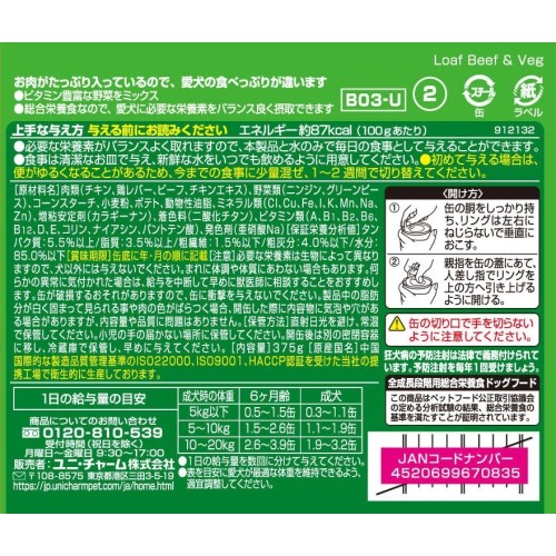 - 肉類(チキン、ビーフ、チキンエキス等)、野菜類(ニンジン、グリーンピース、ポテト)、でん粉類(コーンスターチ等)、穀類(
