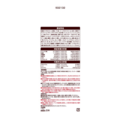 - 穀類(トウモロコシ、小麦粉、パン粉、コーングルテンミール、玄米)、肉類(チキンミール、チキン、チキンエキス)、