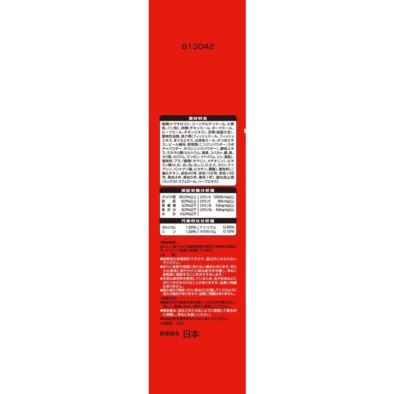- 穀類(トウモロコシ、コーングルテンミール、小麦粉、パン粉)肉類(チキンミール、ポークミール、ビーフミール、チキンエキス)