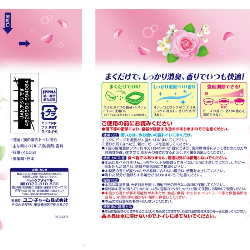 ・今お使いのトイレにまくだけで消臭ビーズがオシッコやウンチの嫌なニオイをしっかり消臭し、香りが広がります。