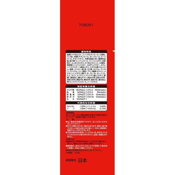 - 穀類(トウモロコシ、コーングルテンミール、小麦粉、パン粉)肉類(チキンミール、ポークミール、ビーフミール、チキンエキス)
