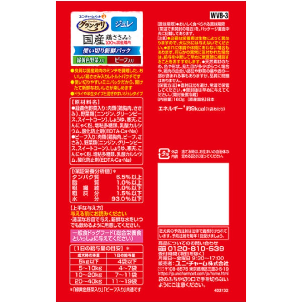 - ●緑黄色野菜入り:肉類(鶏胸肉、ささみ)、野菜類(ニンジン、グリーンピース、スイートコーン)、しょうゆ