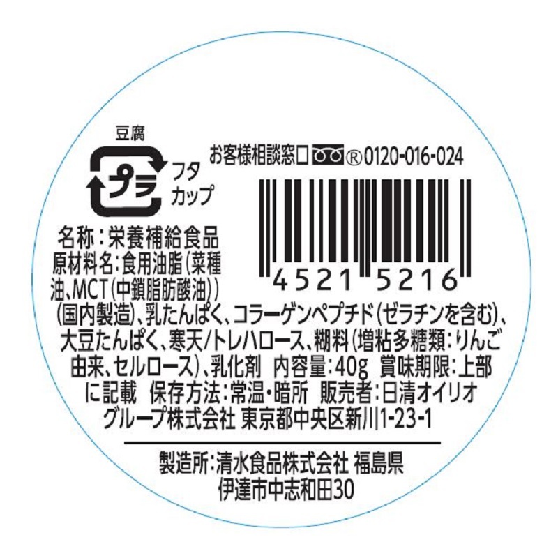 ・たんぱく質3.5g、MCT(中鎖脂肪酸油)6g配合、糖質は2g以下でやわらかく離水が少ない物性です。