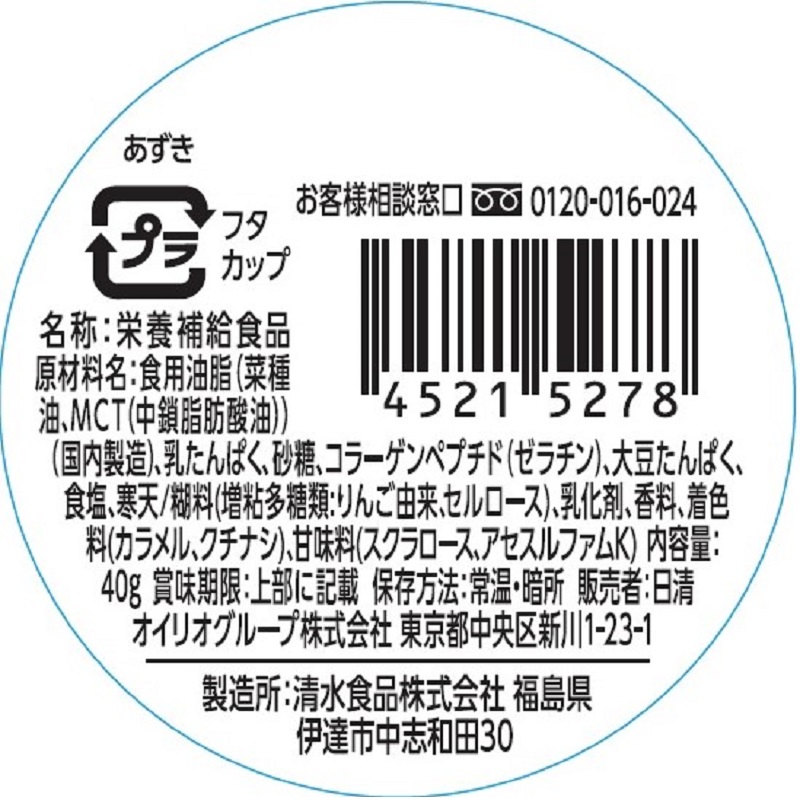 40グラムで160キロカロリー、良質なオイルMCTオイル6グラム、たんぱく質3.5グラムを補給できます。