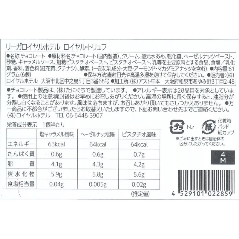 ピスタチオ・ヘーゼルナッツ・塩キャラメル味が楽しめるトリュフ6個の詰合せ。