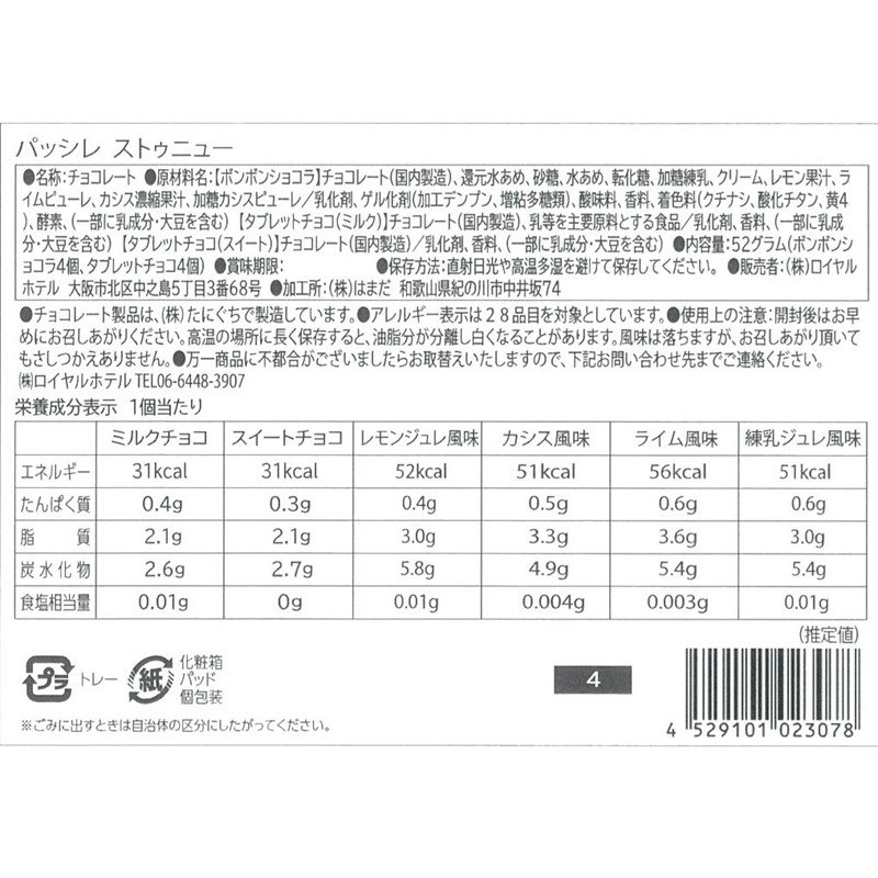 カシス風味・レモンジュレ・練乳ジュレ・ライム風味の4粒のボンボンショコラと、