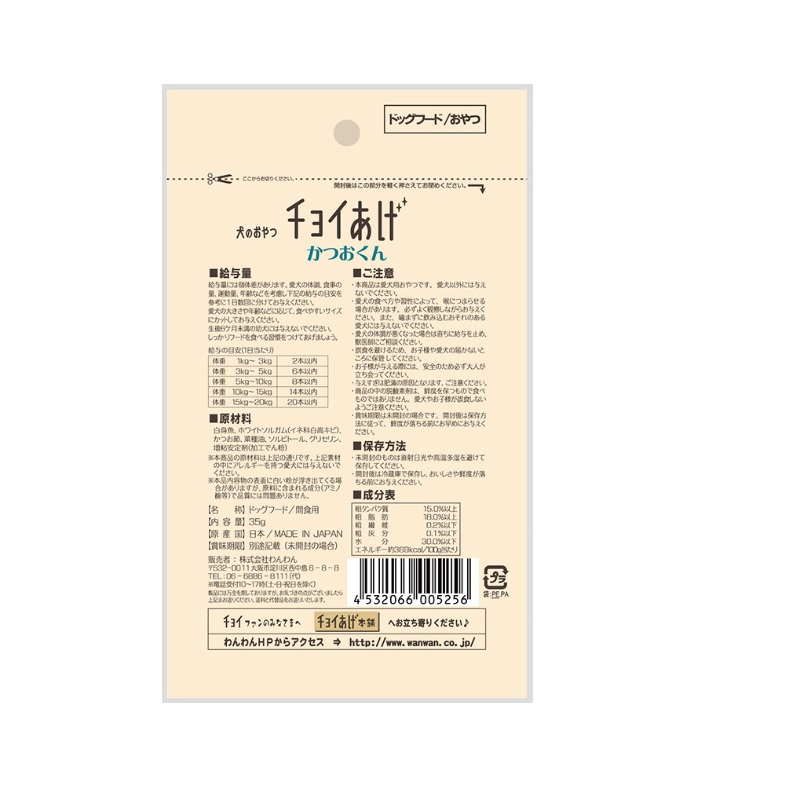 - 白身魚、ホワイトソルガム(イネ科白高キビ)、かつお節、菜種油、ソルビトール、グリセリン、増粘安定剤(加工でん粉)