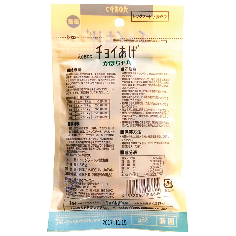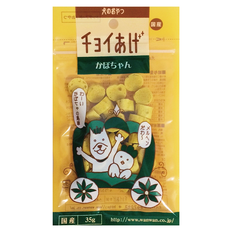 人気の国産、犬のおやつチョイあげシリーズのかぼちゃを使ったヘルシー志向の愛犬用ジャーキーです。