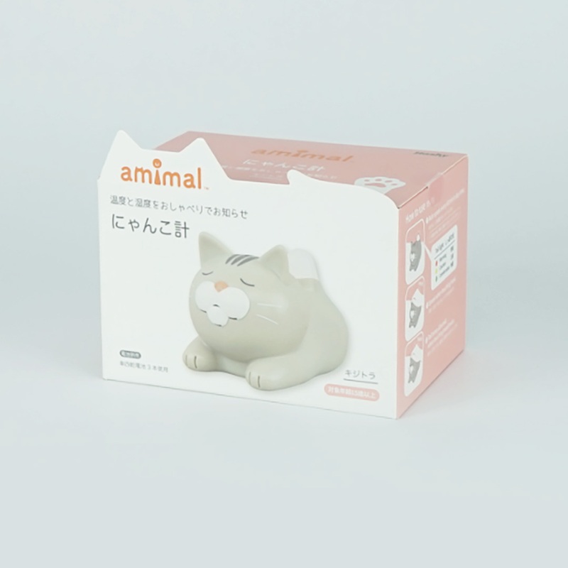 おしゃべりと光で温度と湿度をお知らせする、ねこの形の温湿度計です。
