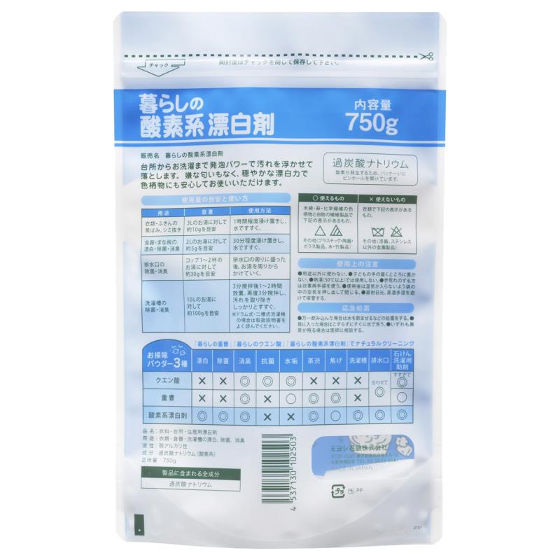 ●衣類やふきんなどの漂白として、嫌な匂いもなく、穏やかな漂白力で色柄物にも安心してお使いいただけます。