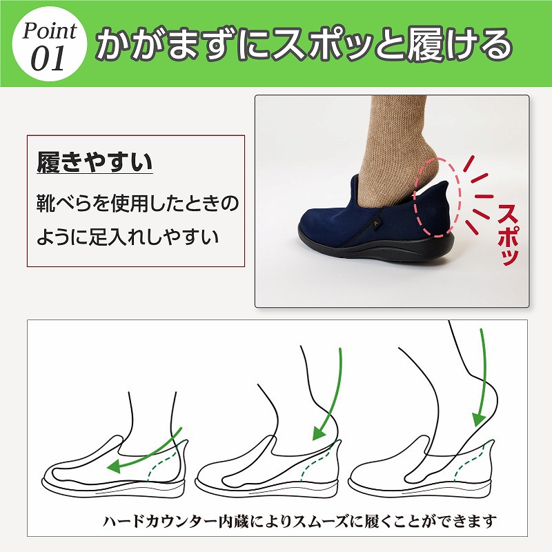 屈まなくても履ける、オールシーズン対応で脱ぎ履きやすい設計。