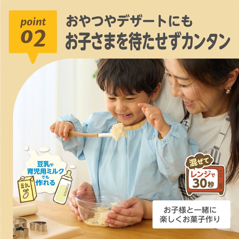 米粉使用でグルテンフリーで安心。準備するものは牛乳のみ、手づかみ食べの練習にもピッタリ。