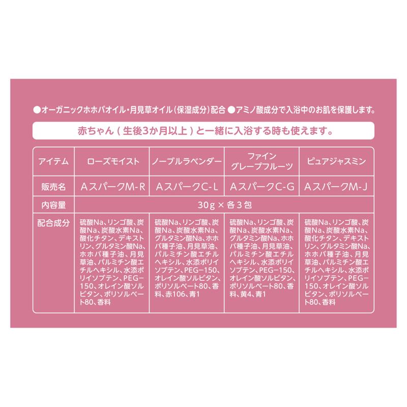 ●ピュアジャスミン…硫酸Na、リンゴ酸、炭酸Na、炭酸水素Na、酸化チタン、デキストリン、グルタミン酸Na、ホホバ種子油