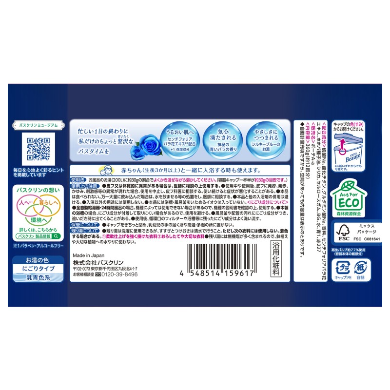 ●人への想い…パラベン・アルコールフリー/皮膚への安全性評価済み/アミノ酸成分配合で水道水中の塩素を除去、まろやかなお湯