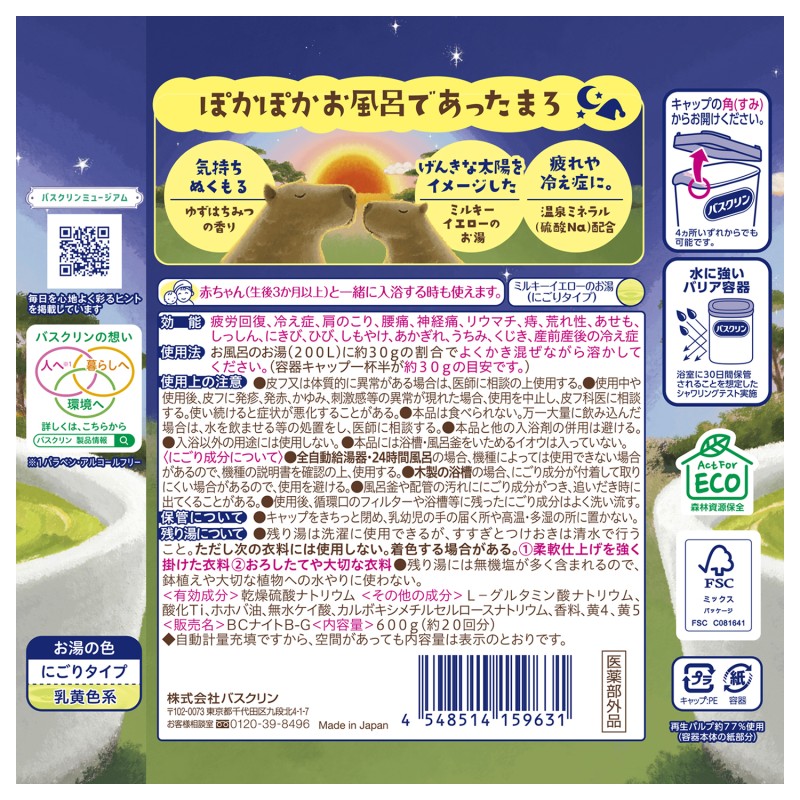●温泉ミネラル(乾燥硫酸ナトリウム)配合。温浴効果を高めて血行を促進、疲れや冷え症に。