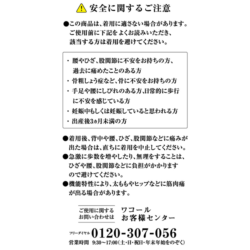 着用後、背中や腰、ひざ、股関節などに痛みが出た場合は、直ちに着用を中止してください。