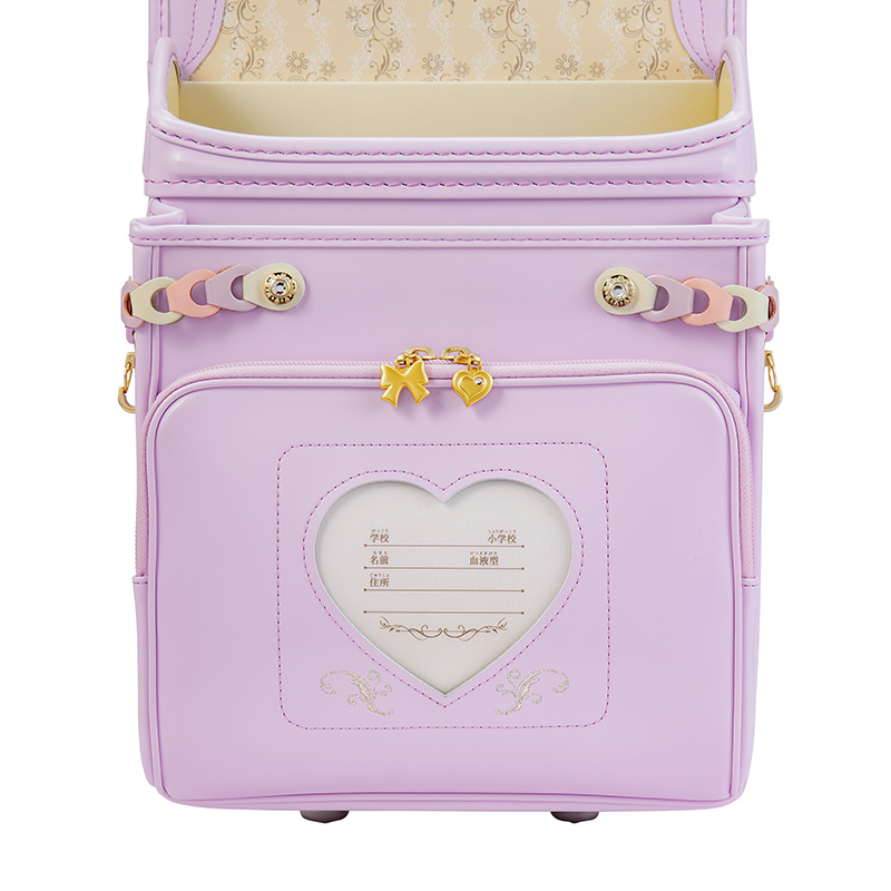 ●前ポケット・・リボン柄とハート柄の引手が付いた大きく開くワイドポケットです。