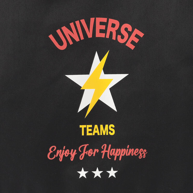 稲妻モチーフと、カレッジロゴを思わせる文字プリントも配した、グラフィカルなアイテムです。