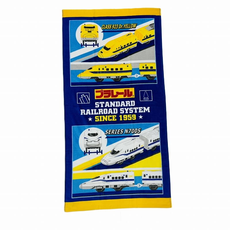 電車のおもちゃ プラレールの人気車両をデザインしたプリントタオル。