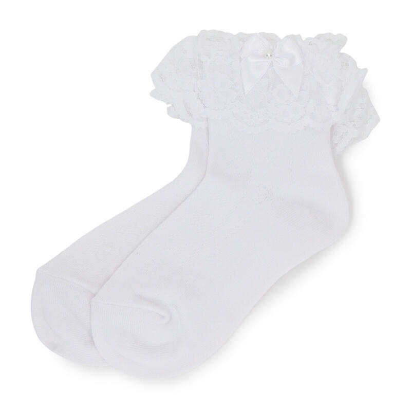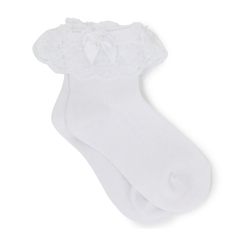 履き口にレースとリボンを配してドレスアップさせたクルー丈ソックス。