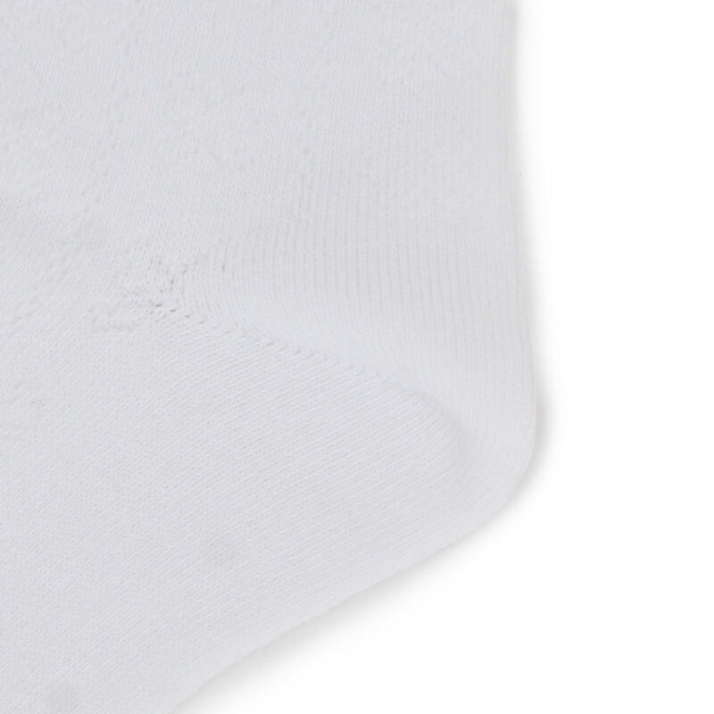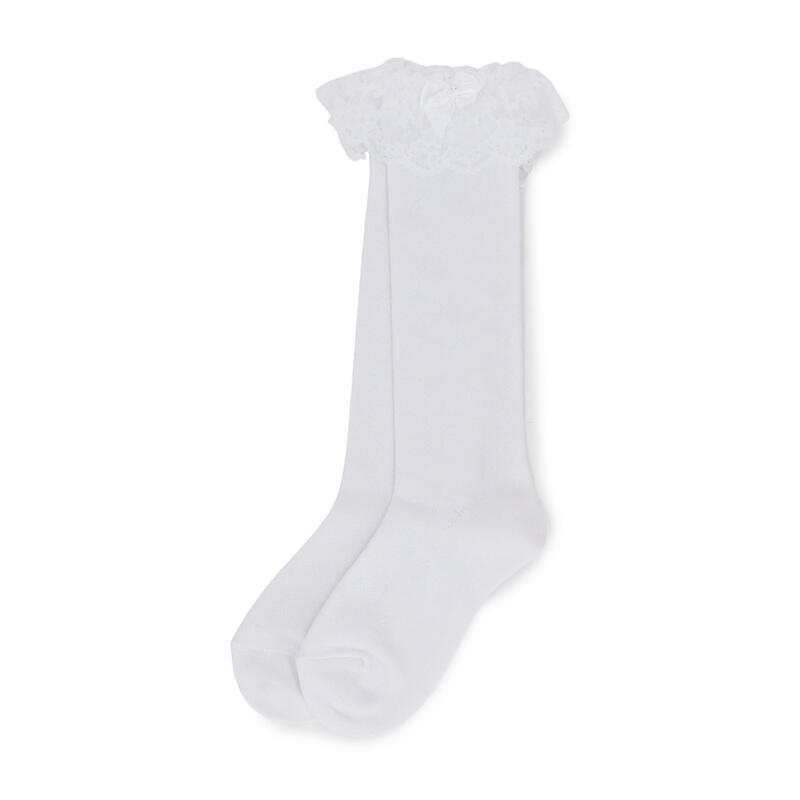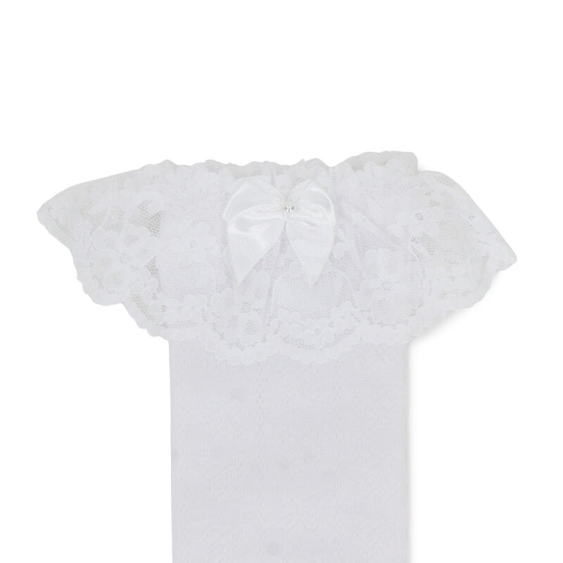 履き口のレースとリボンでドレッシーなアクセントを加えたハイソックス。