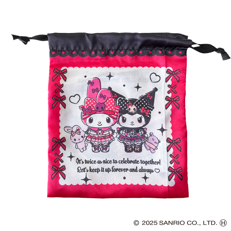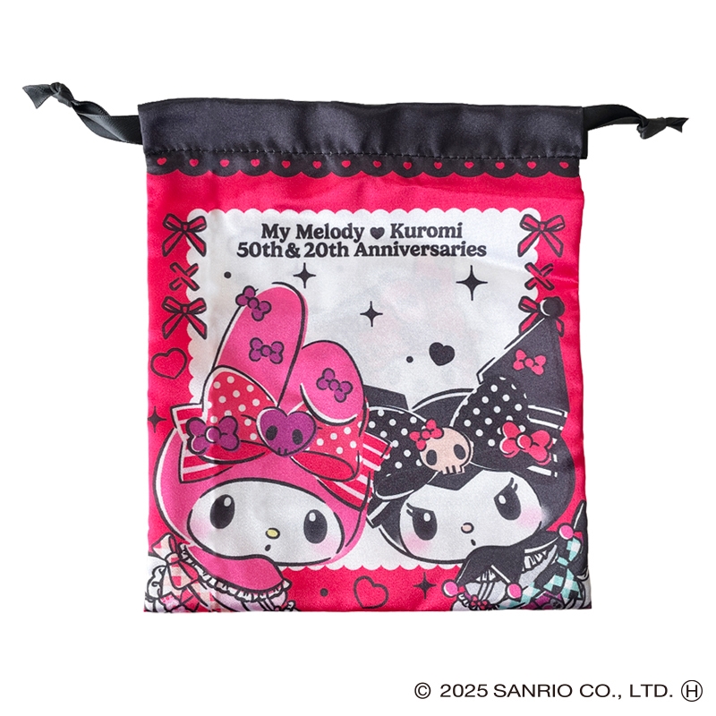 マイメロディ50周年、クロミ20周年を記念した限定コラボのリボン巾着です。サテン生地の手触りが良く、小物入れにオススメ!