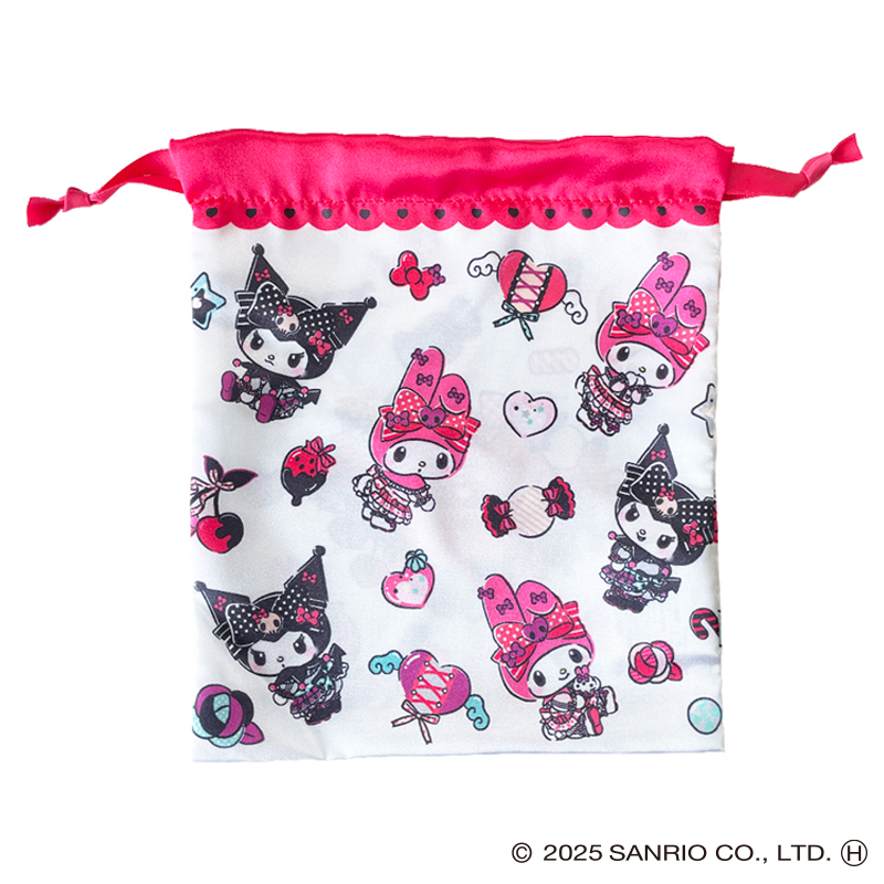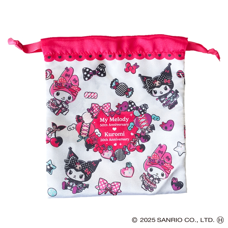 マイメロディ50周年、クロミ20周年を記念した限定コラボのリボン巾着です。サテン生地の手触りが良く、小物入れにオススメ!