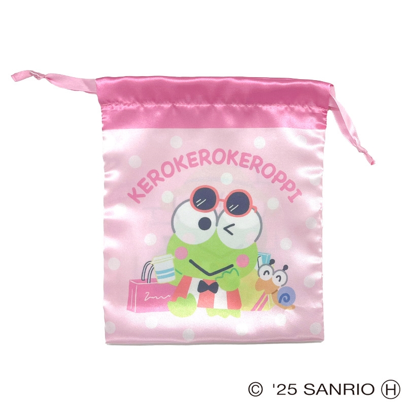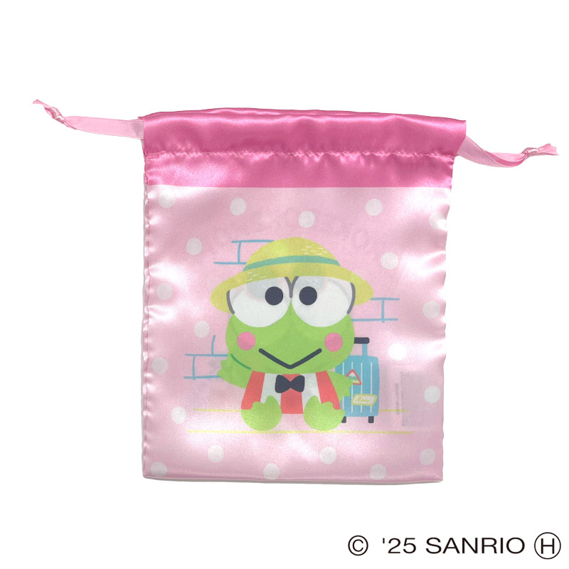 けろけろけろっぴトラベルシリーズのリボン巾着です。サテン生地でかわいく、小物入れにオススメ!