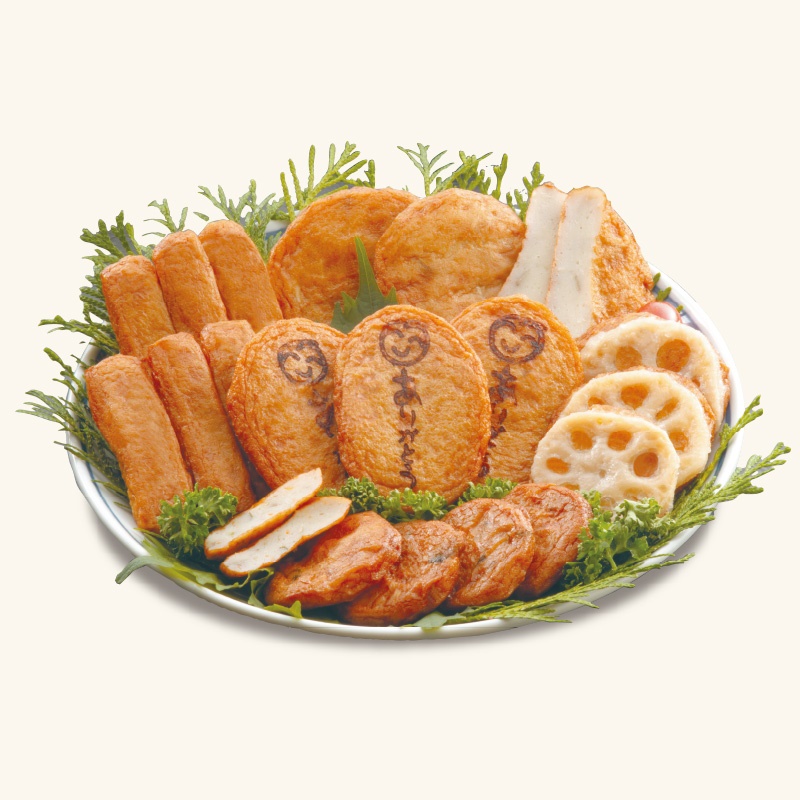 棒天6本、ありがとう焼印入り小判・ごぼう天・れんこん天 各3枚、野菜丸天5枚、メッセージカード付