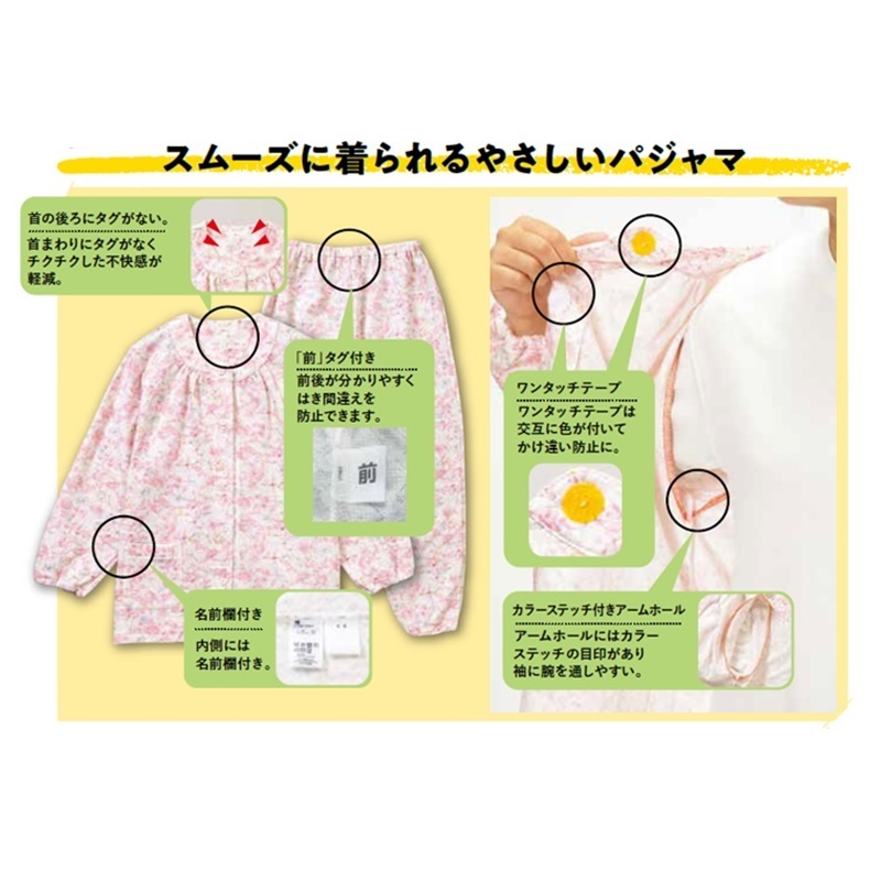 袖ぐり内側にカラーステッチの目印付き、名前が書けるタグ付き。